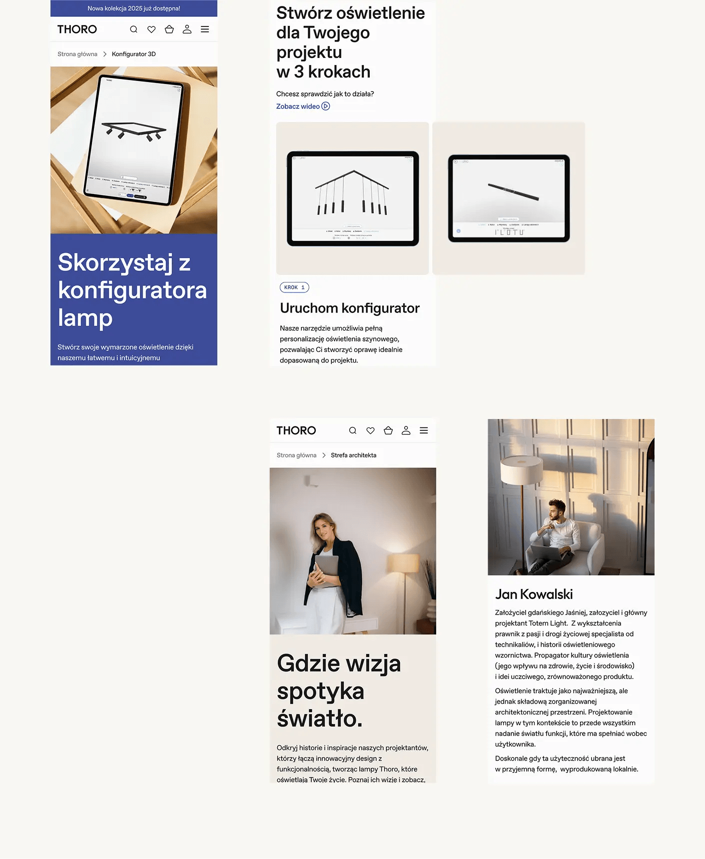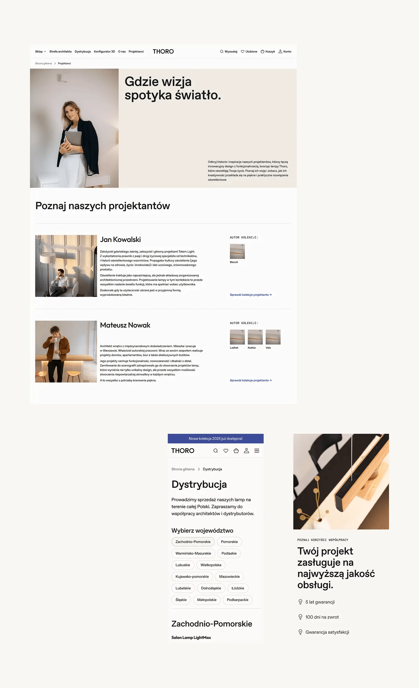 Efektem naszej pracy jest nowy wygląd sklepu internetowego PrestaShop naszego klienta, który kompleksowo odświeżył doświadczenie zakupowe użytkowników. Zaprogramowaliśmy ponad 40 widoków UX/UI przygotowanych wcześniej przez agencję brandingową - zarówno w wersji desktop, jak i mobile, pracując na istniejącej infrastrukturze sklepu (Backend). Projekt obejmował m.in. wdrożenie strony głównej, kategorii, karty produktowej, koszyka i procesu zakupowego, a także podstron takich jak „O nas”, „Dystrybutorzy”, „Projektanci” i wiele innych. Dzięki temu sklep Thoro zyskał nowoczesny i spójny interfejs, w pełni zgodny z nowym brandingiem marki, bez zmiany w działaniu back office (panelu administracyjnego).