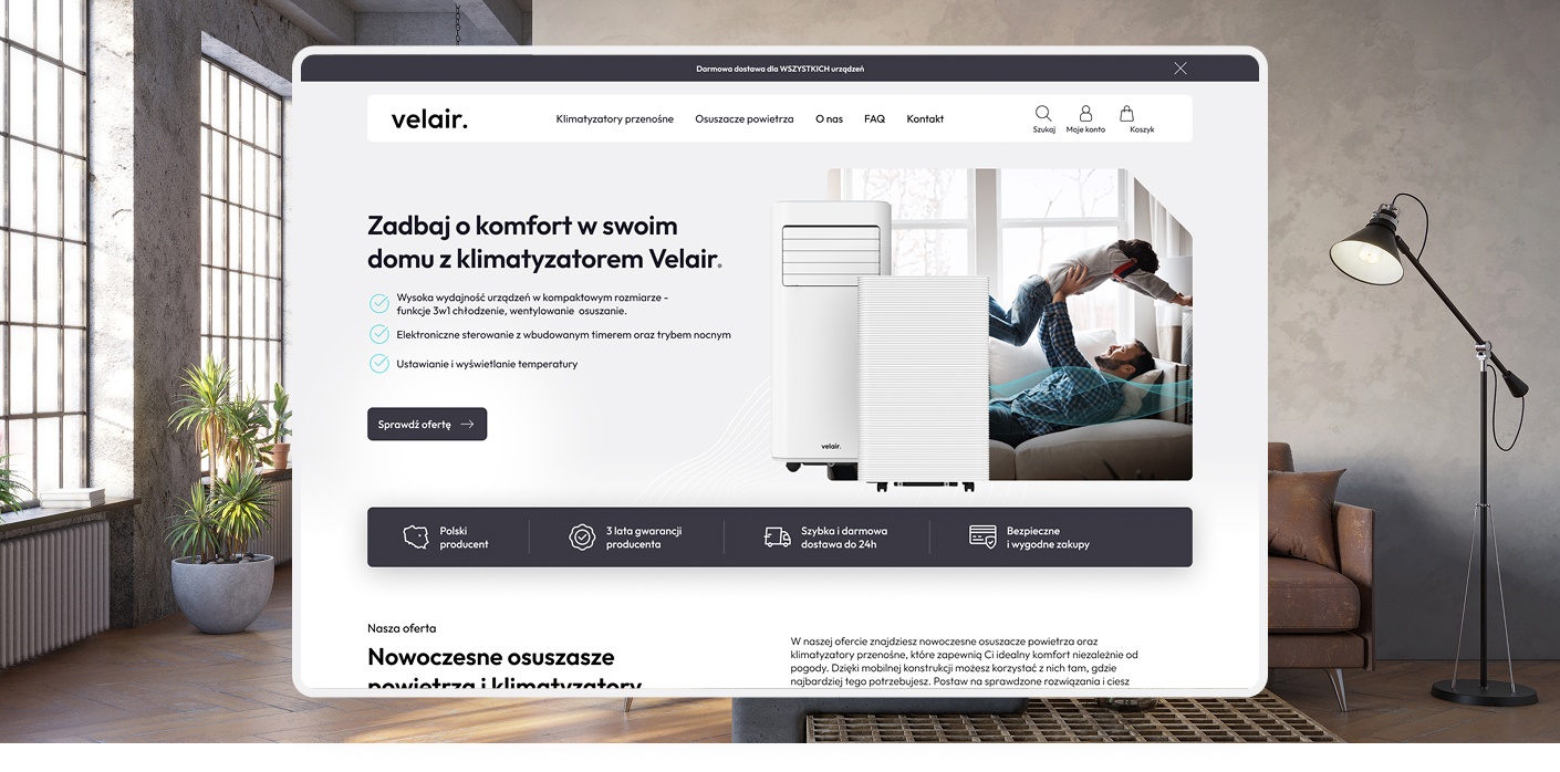 Sklep Velair to polska marka zajmująca się sprzedażą przenośnych klimatyzatorów i osuszaczy powietrza. Naszym zadaniem było zaprojektowanie i wdrożenie butikowego sklepu internetowego Wordpress + WooCommerce.